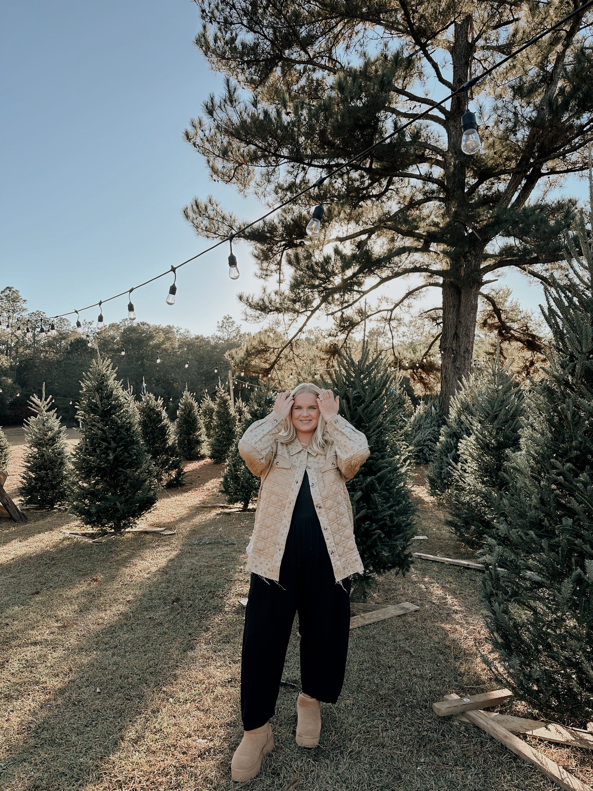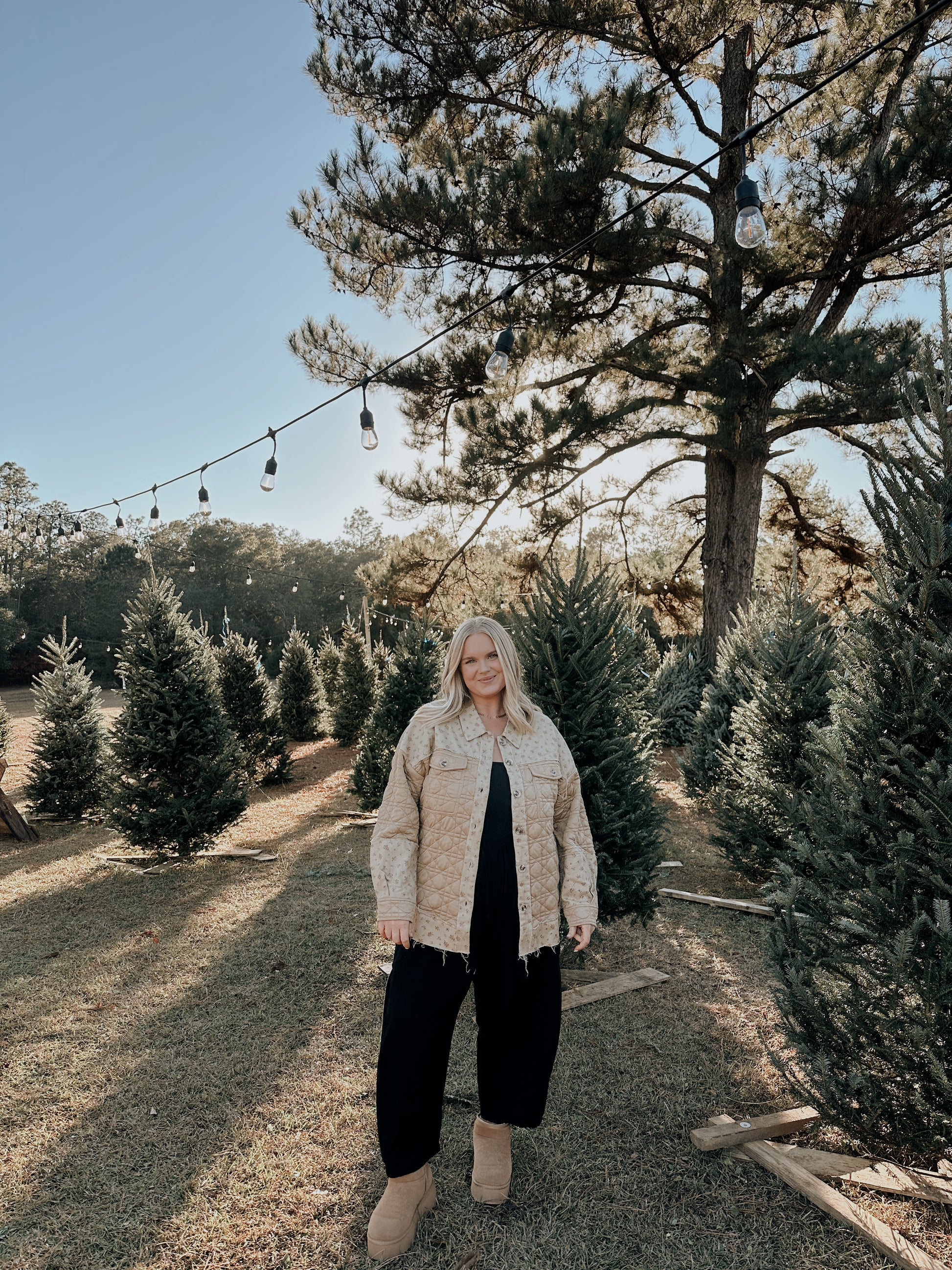 This jacket is a relaxed, quilted “shacket” style — a blend between a shirt and a jacket — designed for cool outdoor days. It features a light beige tone with subtle textured stitching, front chest pockets, and a slightly oversized fit for a comfy, casual look. The soft, padded material adds warmth without feeling bulky, making it perfect for winter outings, walks through tree farms, or cozy seasonal adventures.