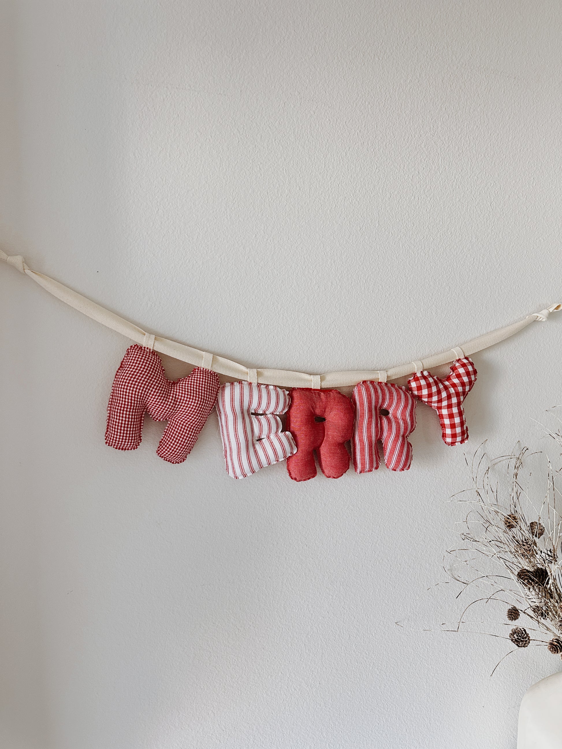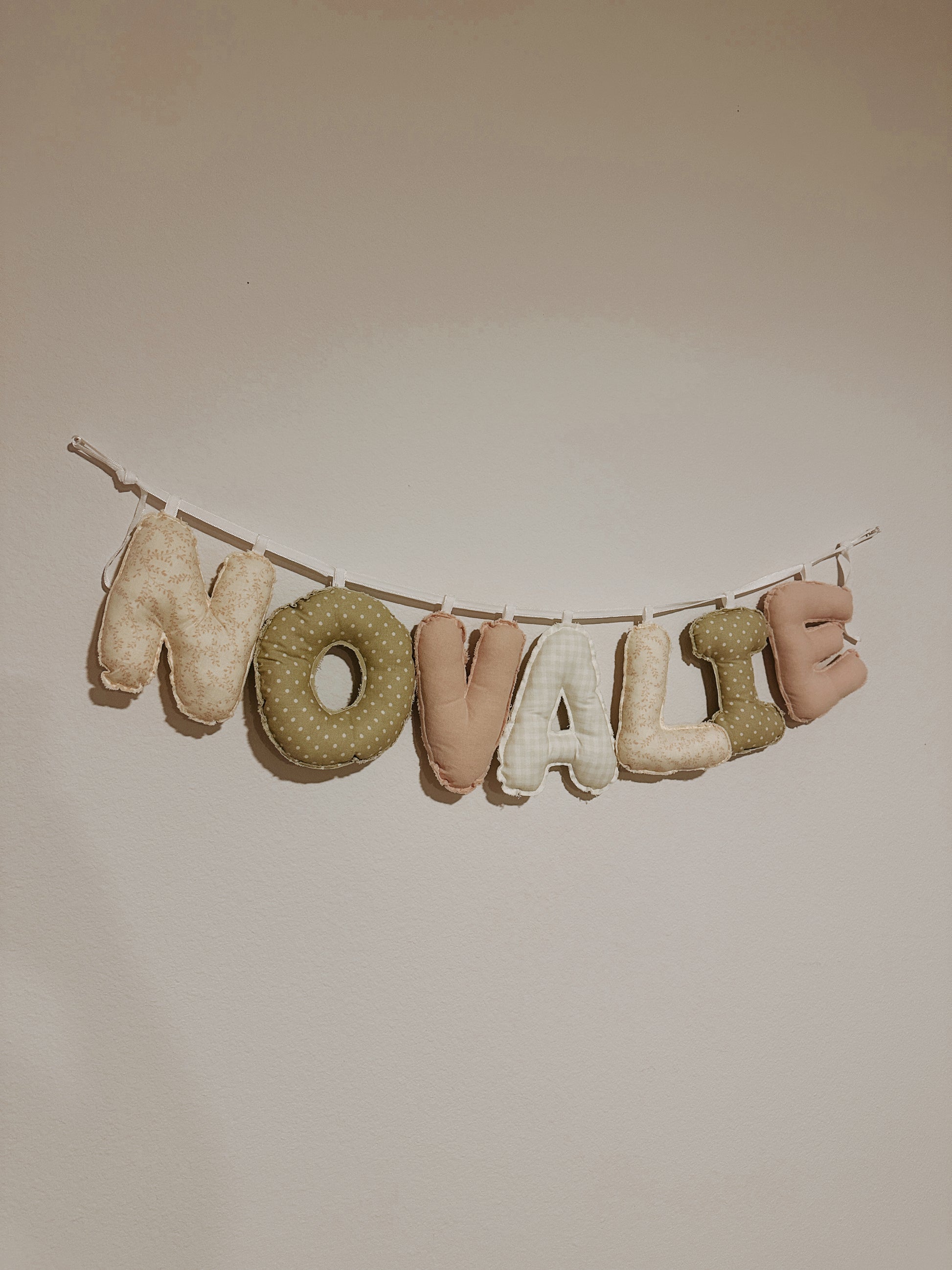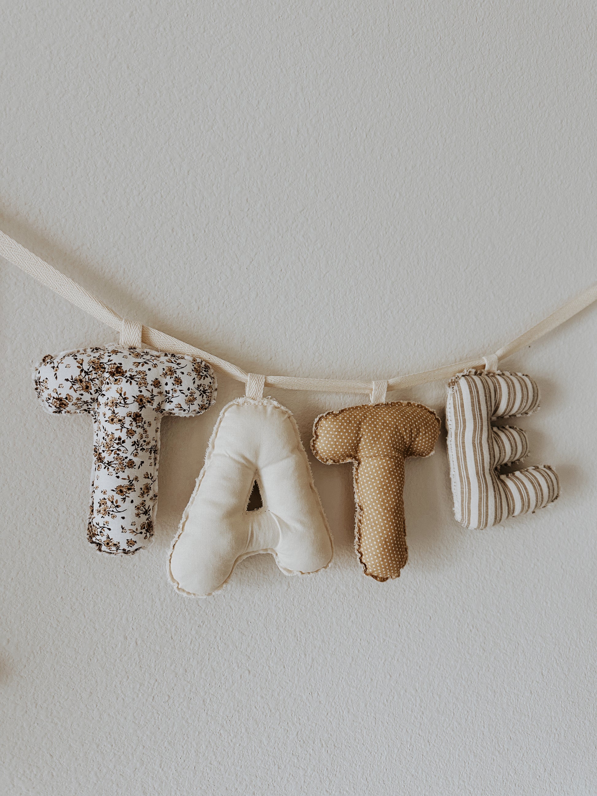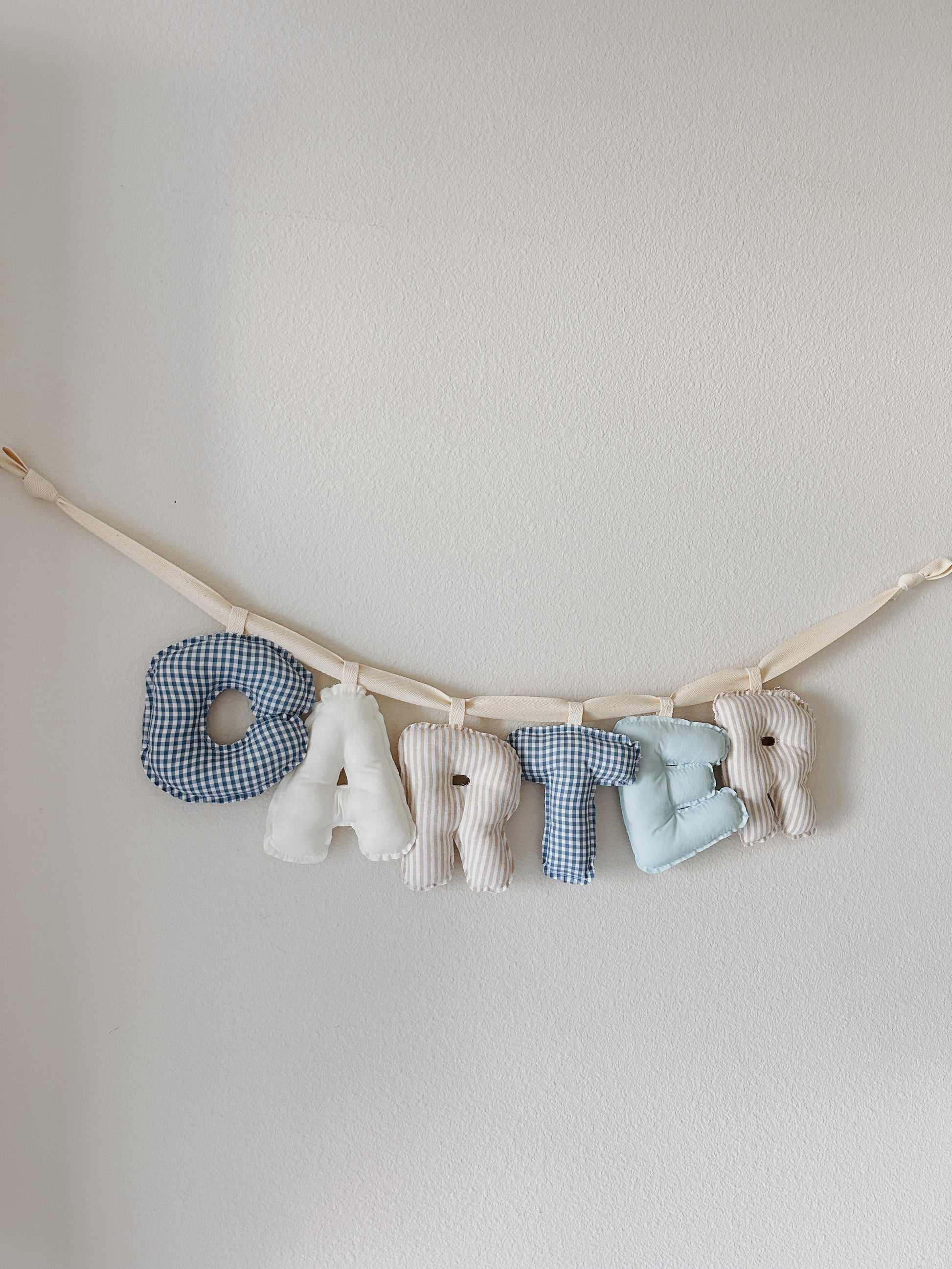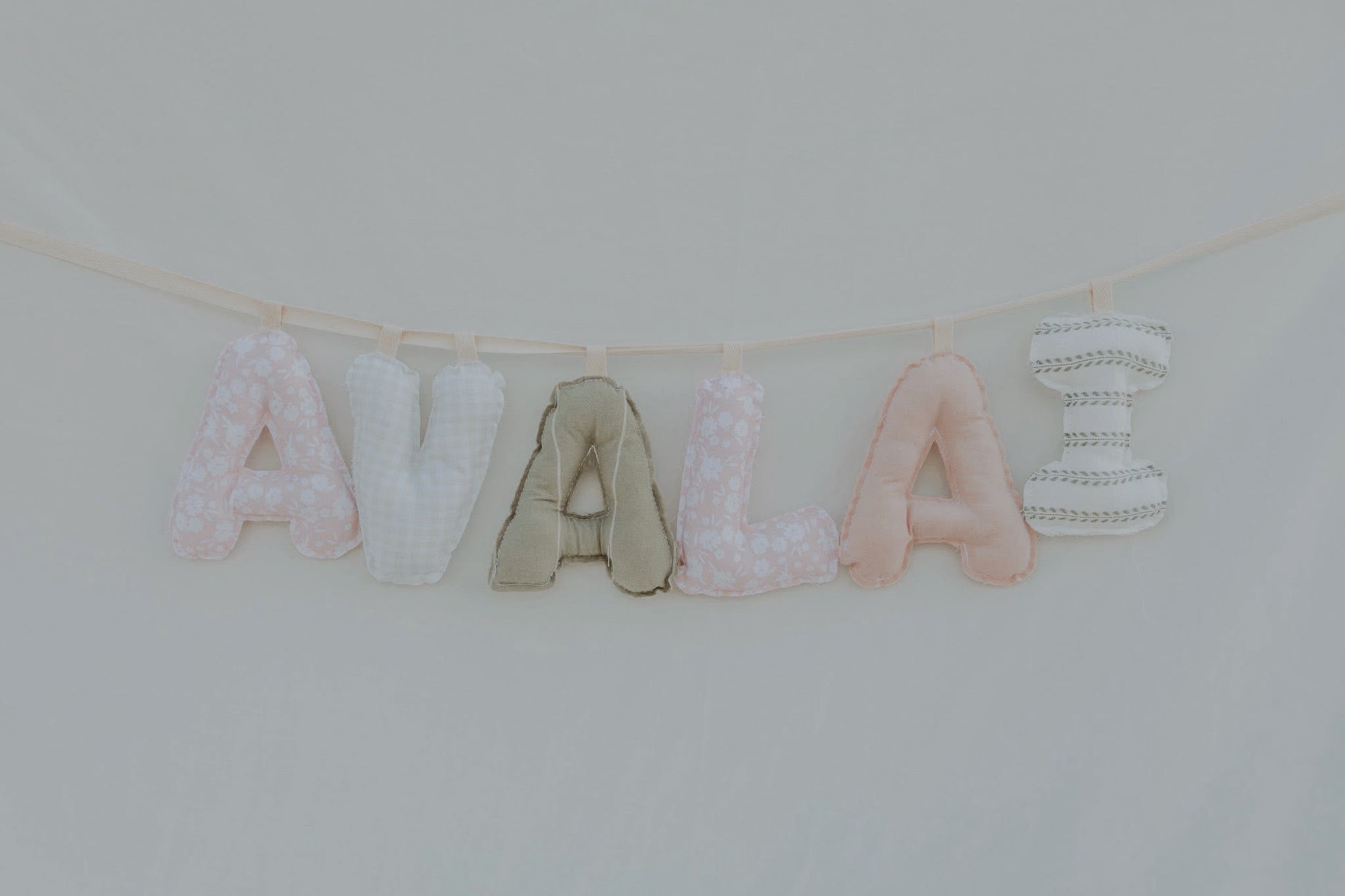 Bring any name or phrase to life with our personalized plush banner. Each letter is individually crafted from soft, stuffed fabric and gently padded to create a charming 3D “puff” effect. Strung together to form your custom message, these cozy, tactile letters make the perfect accent for nurseries, birthdays, playrooms, and special celebrations. Choose from a wide range of colors and fabrics to create a one-of-a-kind keepsake that’s as unique as the name it spells.