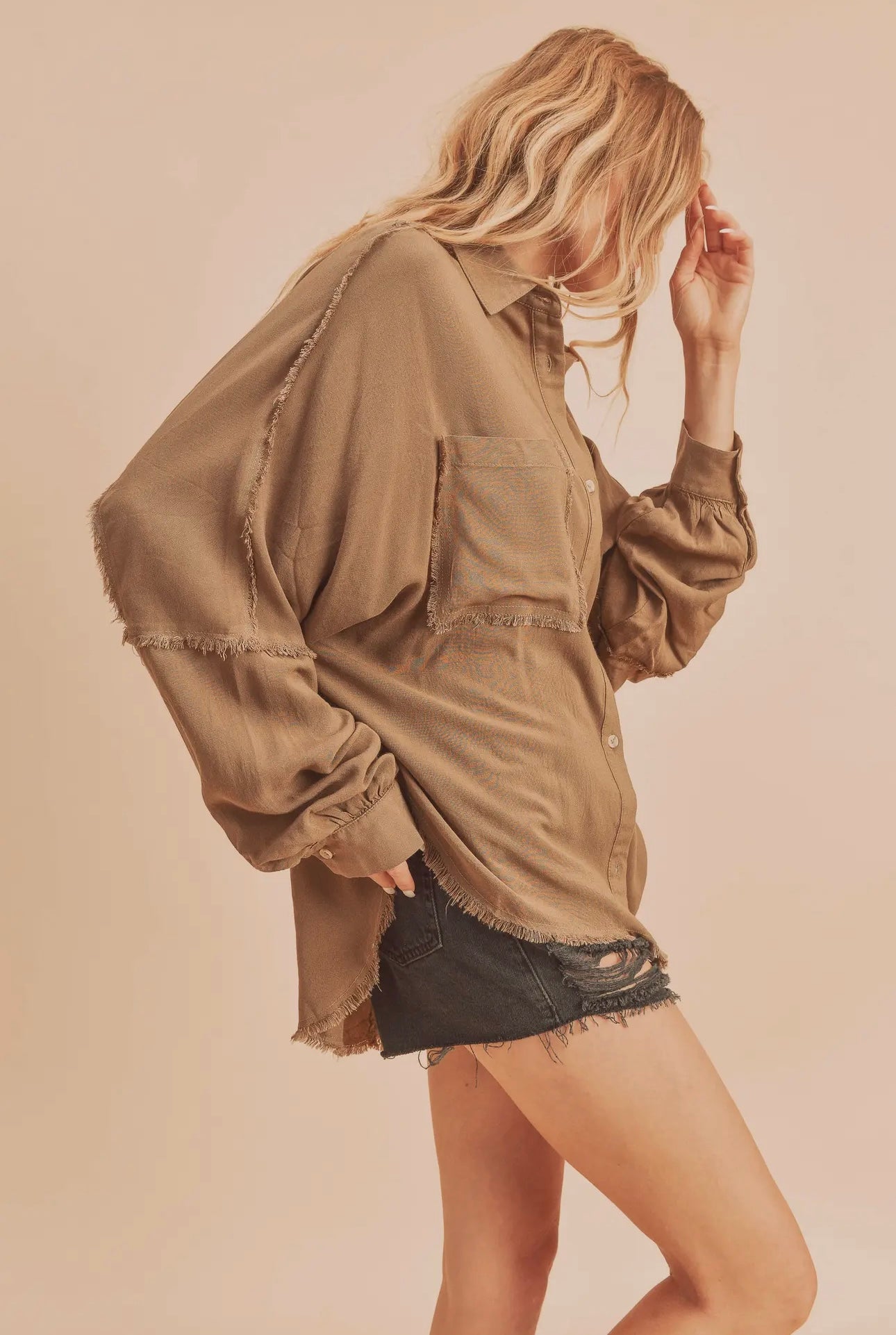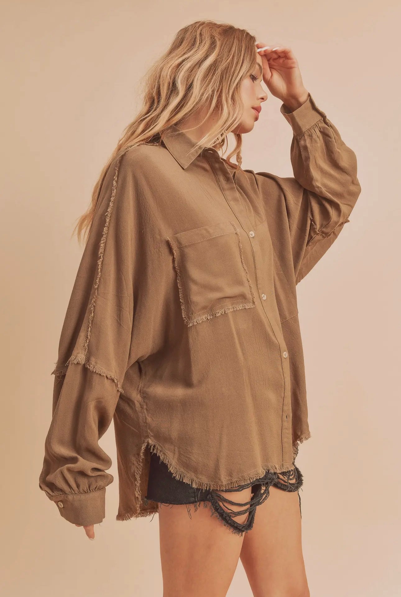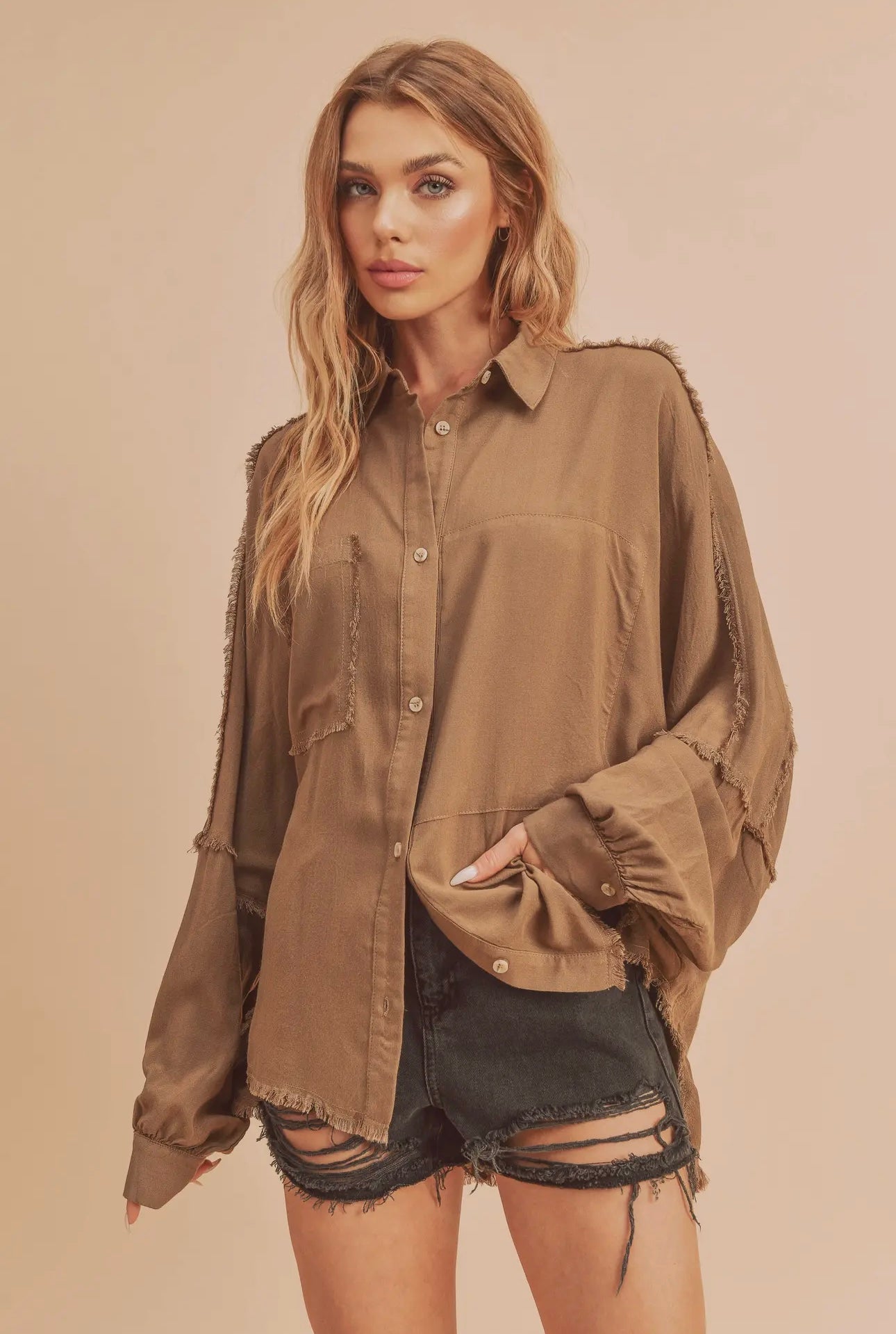 The Daisy Button Down Top is your new wardrobe staple, designed in a timeless style with a relaxed, oversized silhouette. Raw-edge accents give it just the right shape for any outfit. Machine wash cold and hang to dry.