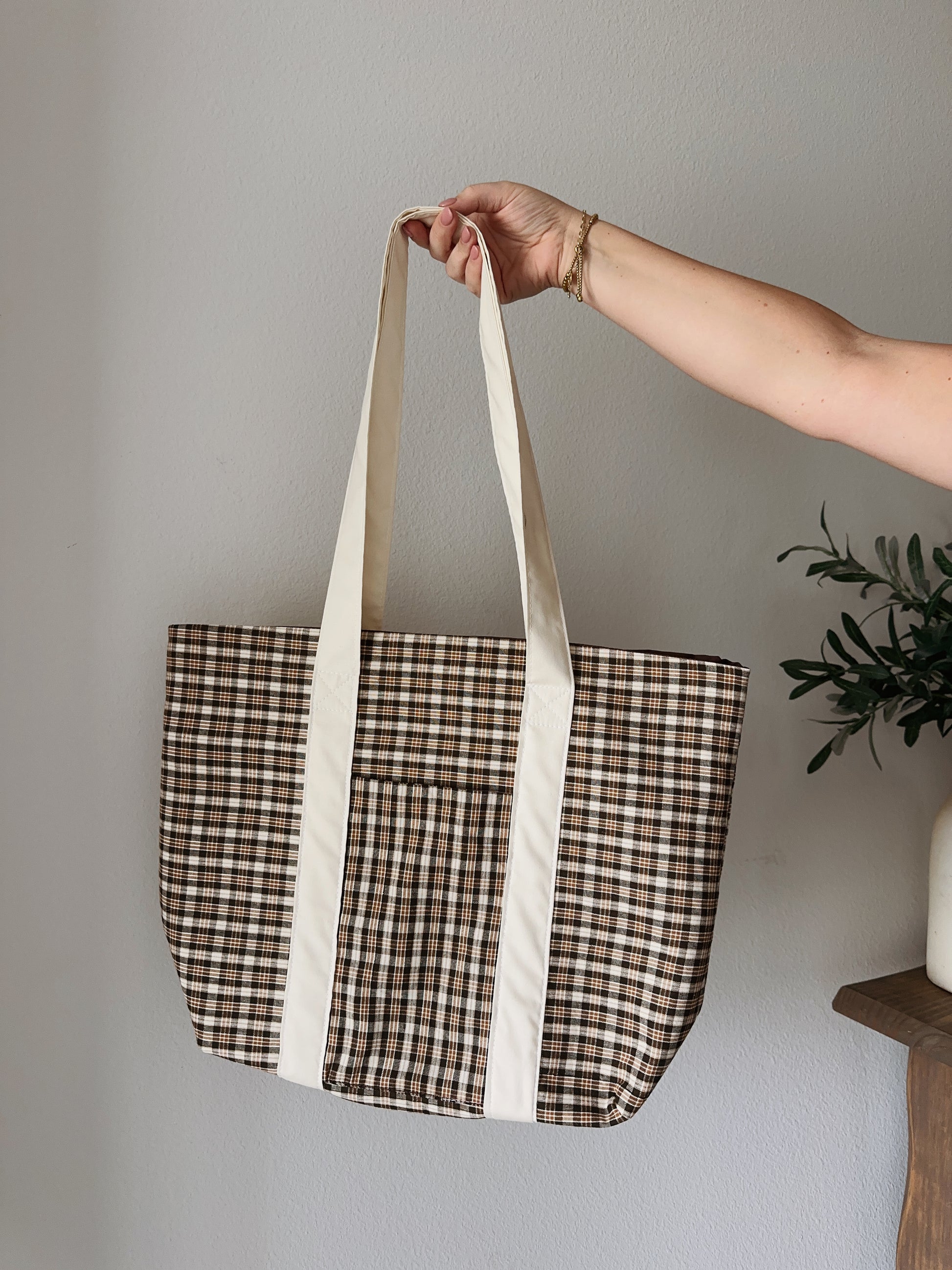 Rich mocha tones meet a timeless plaid pattern for a tote that feels classic yet fresh. Handmade from start to finish, this bag features a roomy interior, a practical front pocket, and sturdy cream straps that add a crisp, modern contrast. Perfect for market mornings, daily errands, or a cozy coffee date, each tote is cut and stitched by hand—making every piece a one-of-a-kind companion.
