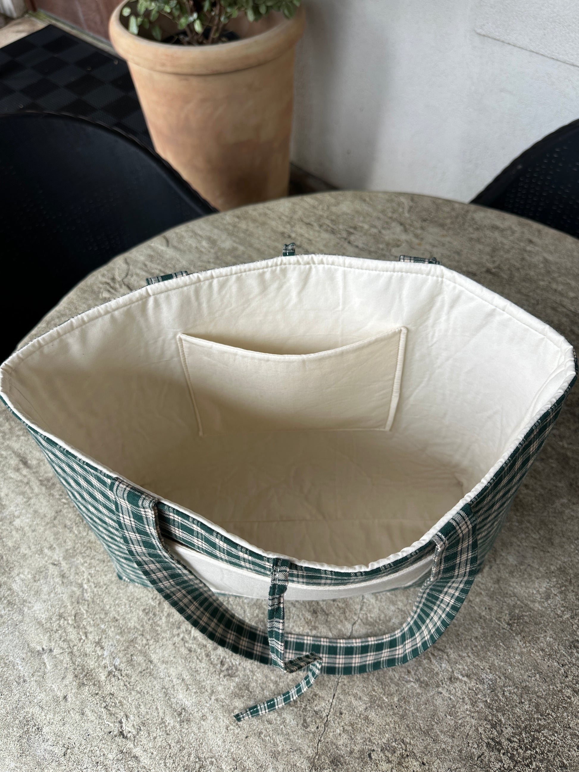 Bring a little cottage charm wherever you go. The Evergreen Market Tote features a timeless green plaid exterior with a soft, neutral front pocket and sweet tie detail for extra character. Roomy enough for farmers market hauls, weekend errands, or a casual day out, this tote blends style and function effortlessly. Made from sturdy fabric with comfortable shoulder straps, it’s your new everyday grab-and-go bag