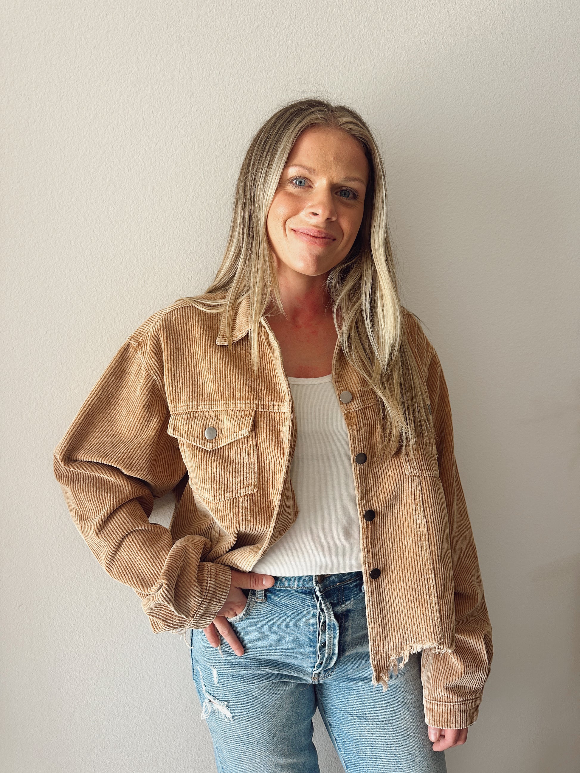 This casual cropped jacket is made from textured corduroy fabric, giving it a cozy yet structured look. It features a button-front closure, flap chest pockets, and a raw hemline that adds a touch of edge. The oversized sleeves and relaxed fit make it perfect for layering over tanks or tees. Its versatile neutral tone makes it easy to style with denim, skirts, or casual dresses for an effortlessly laid-back vibe.