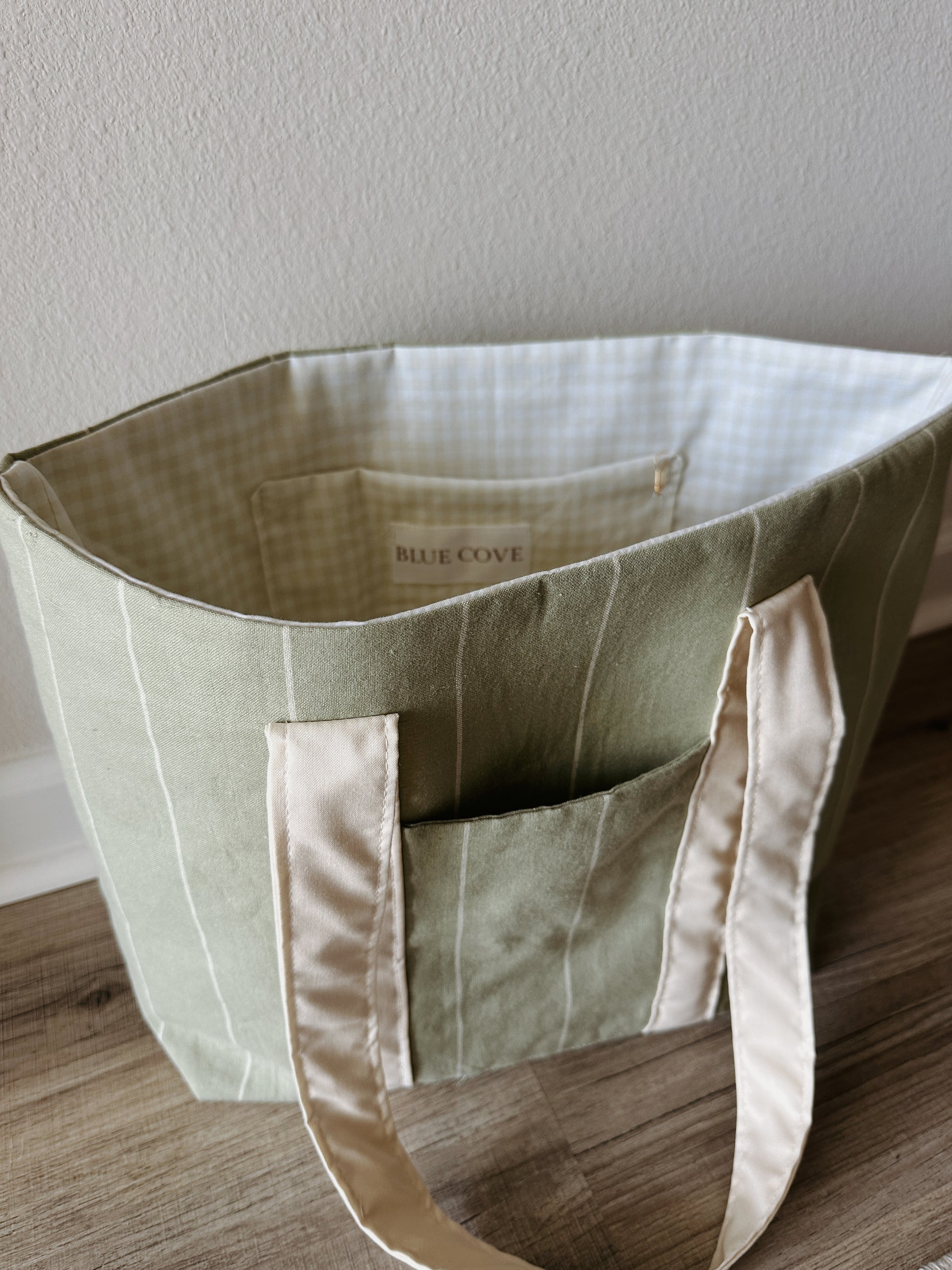 Soft sage green with delicate white stripes—like sunlight through willow leaves. The Willow Stripe Tote is handmade from start to finish, featuring a spacious interior, a practical front pocket, and sturdy cream straps for effortless carrying. Perfect for market strolls, coffee runs, or everyday adventures, each tote is cut and stitched by hand, making every piece one of a kind.